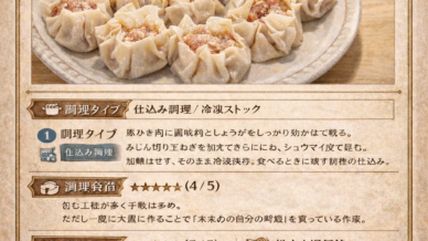 作り置き お家シュウマイ(作り置き冷凍) ① 調理タイプ仕込み調理/冷凍ストック豚ひき肉に調味料としょうがをしっかり効かせて練る。みじん切り玉ねぎを加えてさらにこね、シュウマイ皮で包む。加熱はせず、そのまま冷凍保存。食べるときに蒸す前提の仕込... 2026.01.30 作り置き